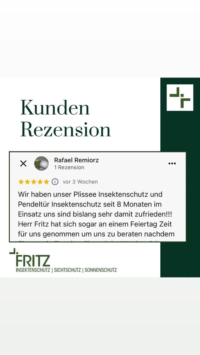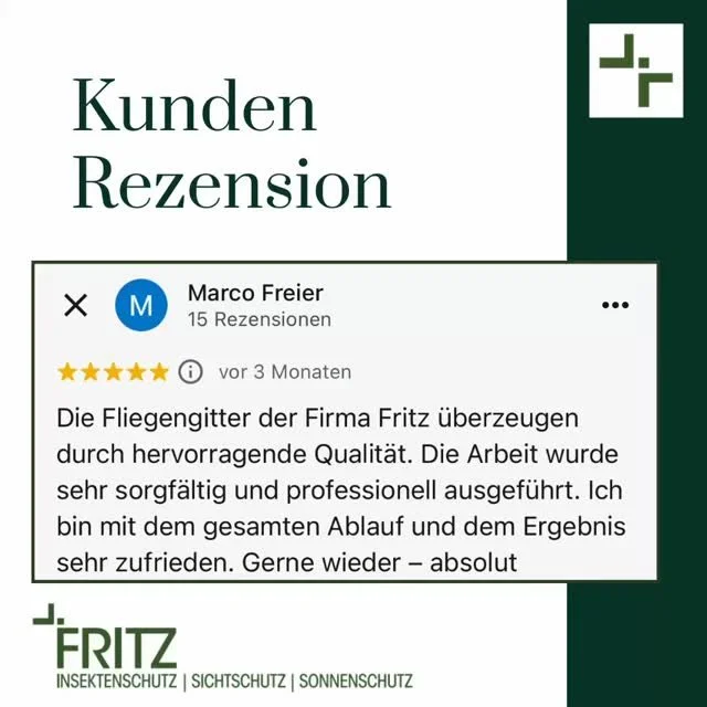 Man kann sich allen Vorrednern wirklich nur anschließen. Auch wir sind sehr begeistert von Fritz Insektenschutz. Von den Terminabsprachen über das Aufmaß bis zur Montage war einfach alles perfekt, immer transparent und sehr schnell.Die Qualität des Produkts ist natürlich ebenfalls erstklassig, keine Frage. Wir haben eine Pendeltür im Wohnbereich einbauen lassen und sind einfach nur begeistert.