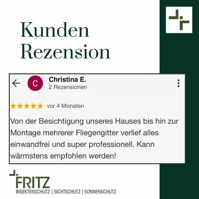Man kann sich allen Vorrednern wirklich nur anschließen. Auch wir sind sehr begeistert von Fritz Insektenschutz. Von den Terminabsprachen über das Aufmaß bis zur Montage war einfach alles perfekt, immer transparent und sehr schnell.Die Qualität des Produkts ist natürlich ebenfalls erstklassig, keine Frage. Wir haben eine Pendeltür im Wohnbereich einbauen lassen und sind einfach nur begeistert.